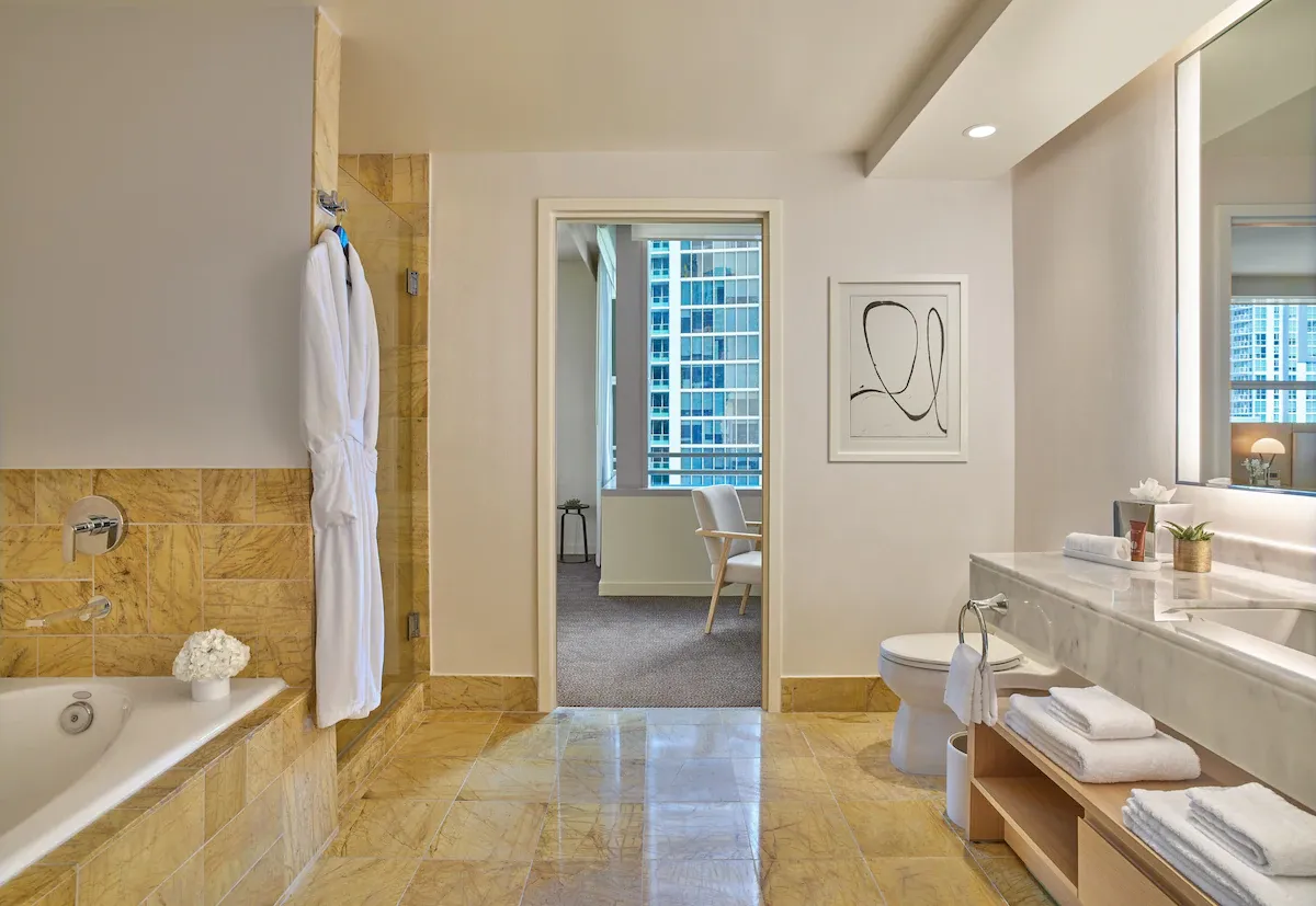 Inside Four Seasons Hotel Miami, one of the most luxurious hotels in Brickell, featuring elegant guest rooms, marble bathrooms, a resort-style waterfront pool, a full-service fitness center, and refined public spaces in the heart of downtown Miami.