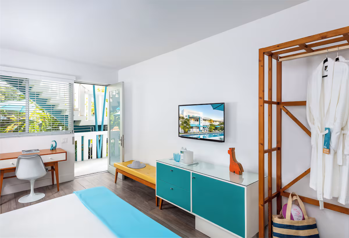 Vagabond Hotel Miami is a classic mid-century boutique hotel offering affordable rooms, a relaxed pool courtyard, and a prime location near Miami Beach. With bright guest rooms, stylish workspaces, and a spacious outdoor pool with bar seating, Vagabond is a top pick for travelers looking for a cheap hotel in Miami that still delivers comfort, design, and a true South Florida vibe.